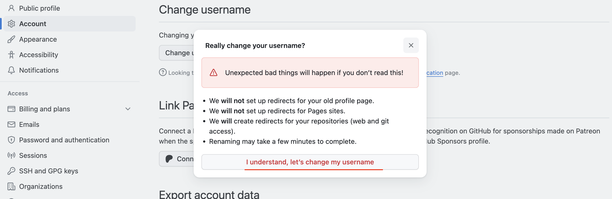 步骤四:点击“Change username”(更改用户名)的按钮,会有一个提示弹窗(如下图所示)。阅读提示,看看更改用户名会对你造成什么样的影响。如果没有问题,仍然需要修改,则点击“I understand, let’s change my username”(我明白,继续修改)